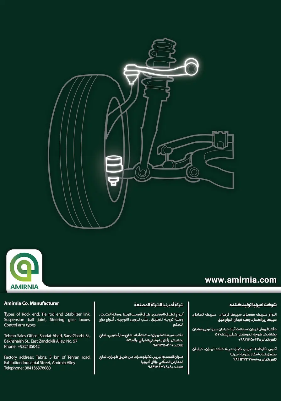 شرکت تولیدی صنعتی امیرنیا در سال 1369 با هدف والای کمک به ارتقاء صنعت ایران فعالیت خود را با طراحی، تولید و صادرات انواع قطعات سیستم تعلیق و فرمان خودروهای سواری درتبریز آغاز نموده است. گستره وسیع محصولات ،کیفیت بالا، قیمت مناسب به همراه مطالعات مشتری محور، امیرنیا را تولید کننده پیشرو قطعات یدکی خودرو در خاورمیانه نموده است.